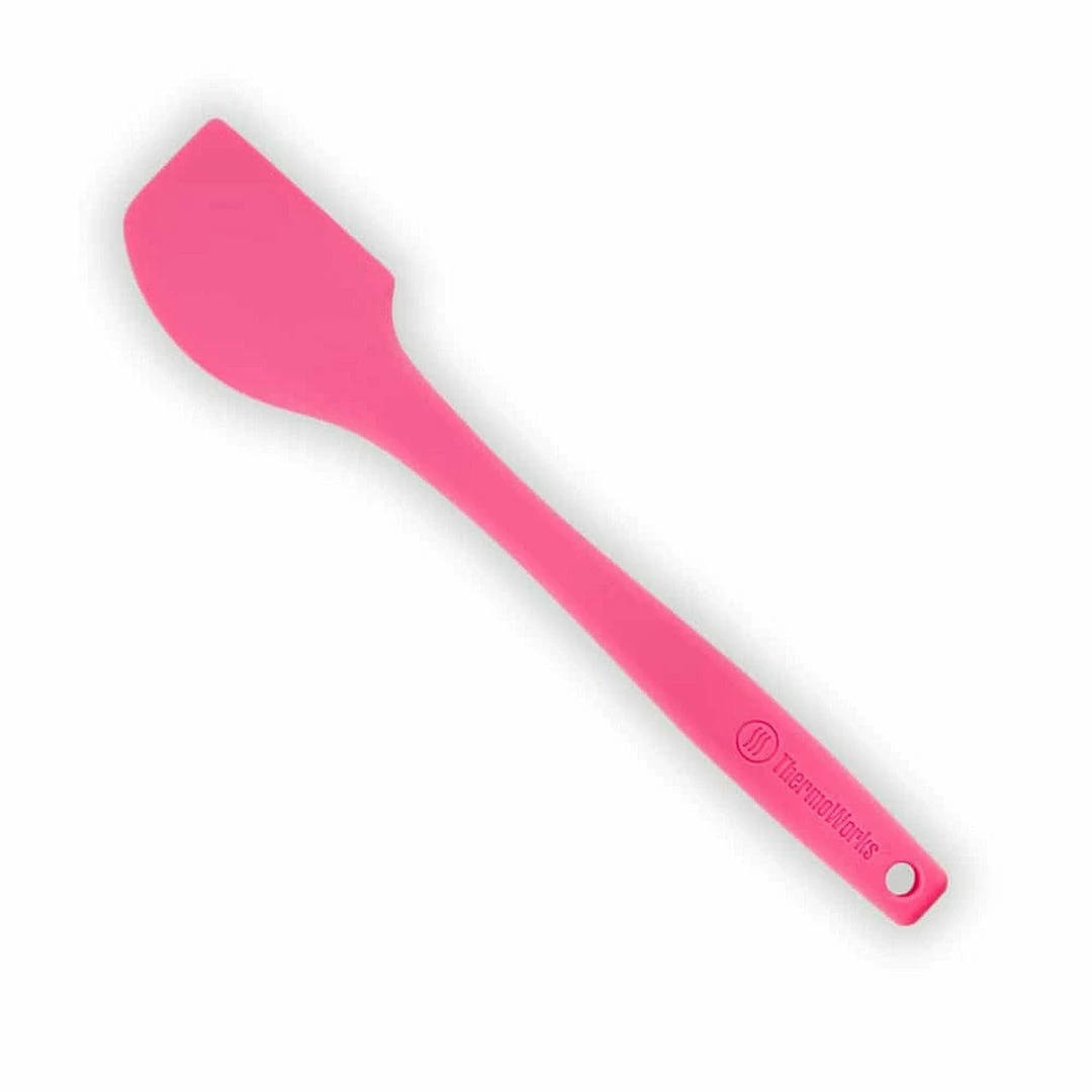 Why are we selling spatulas? If you have a Thermapen for home use, then we know you want the very best thermal tools for the kitchen. Designed by ThermoWorks the spatula’s square corner fits into tight spots in a pan or in jar bottoms. Edges are smoothly tapered to a sharp point for scraping. The smooth matte surfaces compliment the contours for perfect spreading. The molded silicone handle fits the hand for a confident grip. With no seams or creases to trap food, this spatula is a breeze to keep clean. Plus, you can just throw it in your dishwasher. The weighting and length are ideal for wielding in a variety of kitchen tasks from mixing, folding, serving, spreading, scraping, stirring and flipping. Use it in a batter or at the stove. Keep it off the burner itself, but we use ours for scratch-free stirring of sautes in non-stick pans.