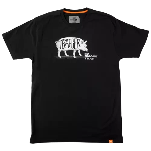 Break out the I’d Smoke That Pig T-Shirt next time you’re firing up a rack of ribs on your Traeger.