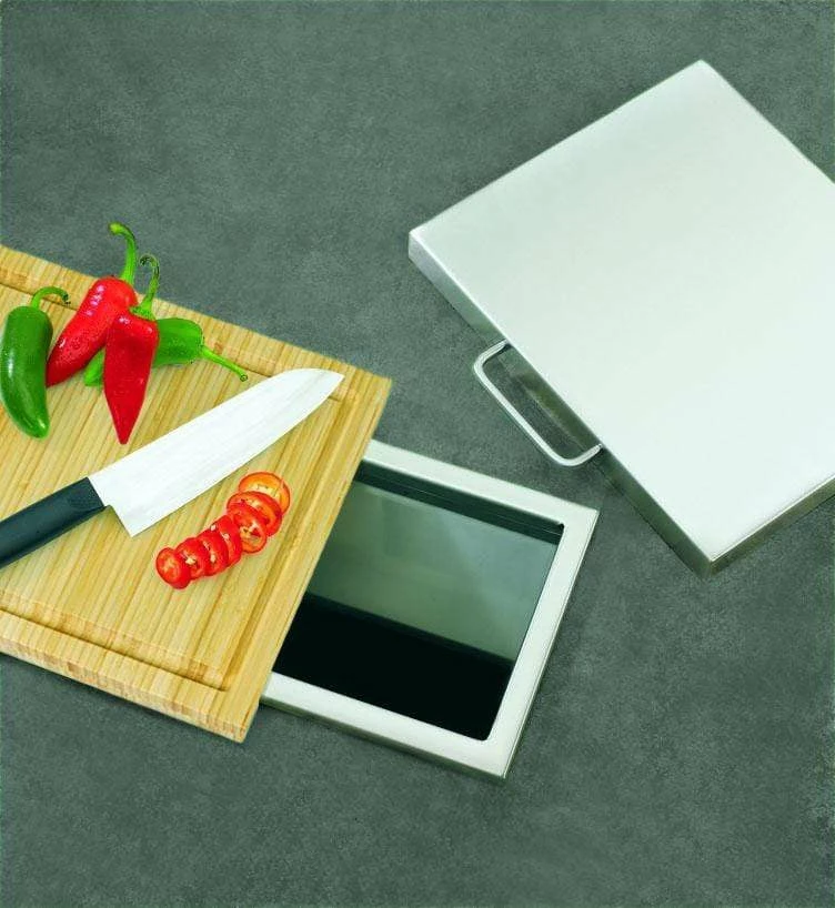 CUT & TOSS. Smart, low profile trash chute aligns over built-in trash drawers (TETD18T-B or TETD182T-B) for easy waste disposal. A convenient cutting board serves as a practical sliding lid. A stainless steel cover fits over the cutting board and chute to conceal when not in use.