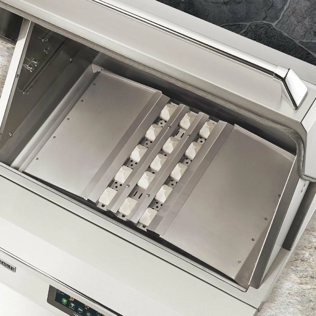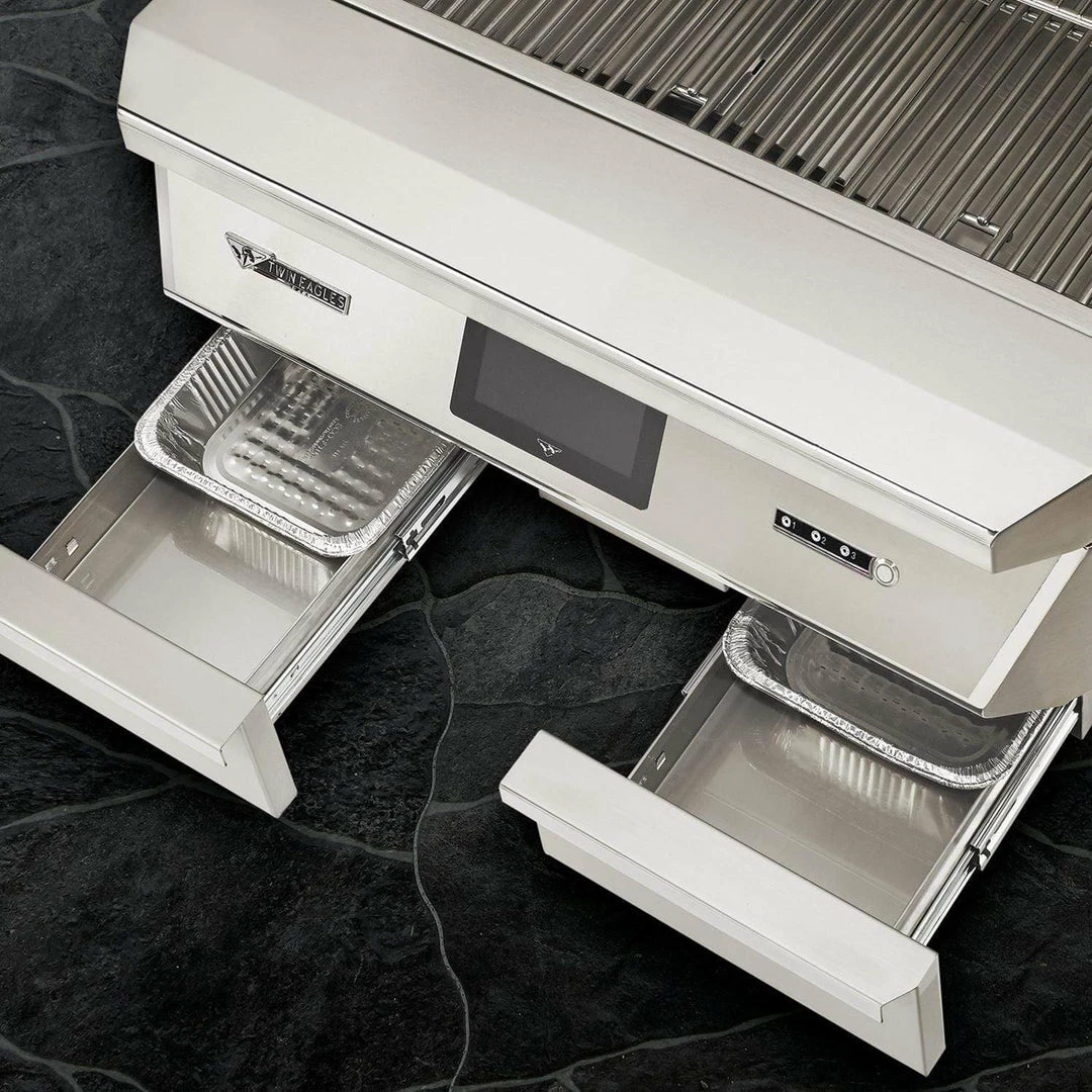 Twin Eagles offers the outdoor cooking equipment you deserve with unparalleled performance and convenience with their wood fired pellet smoker and grill. The Twin Eagles pellet grill features premium-grade 304 stainless steel with seamless heli-arc welded construction for maximum strength and durability and finished in their signature high-polished accents. The double-lined hood combined with a heavy duty, oven grade, braided 304 stainless steel gasket create the perfect insulation and seal for maximum heat retention. With an integrated Wi-Fi controller and free Twin Eagles Mobile App (iOS and Android) and three (3) temperature probes, you have the freedom to control your multiple food items from anywhere you desire. The grill can also be controlled using the integrated weather proof touch screen control that allows you to manually set temperatures from 140-725 degrees Fahrenheit or simply choose from one of the several pre-programmed food items with multiple levels of doneness. This pellet grill has a 16 gauge stainless steel vaporizer plate that promotes natural convection and turns drippings into flavorful smoky vapors. This grill provides direct heat cooking to beautifully sear your steaks, chops or vegetables with the radiant heat briquette tray or the lump charcoal tray. You can easily access the front load 13 pound pellet hopper to check the pellet level and refill your natural wood pellets when necessary. The grill has two (2) independent drip tray drawers with removable and disposable pans for easy clean up and additional storage for accessories. The grill has three (3) hanger hooks allowing you to suspend your meat over the grill surface for even cooking and smoke flavor. The heavy-duty rotisserie system has fully integrated motor with 100 pound turning capacity and a chain-driven design providing consistent and uniform rotation of the rotisserie rod. Whether you want to smoke, bake, grill, sear, or rotisserie, you will receive excellent results with this amazingly versatile Twin Eagles Pellet Grill! Twin Eagles products are designed and manufactured in the USA with pride.
