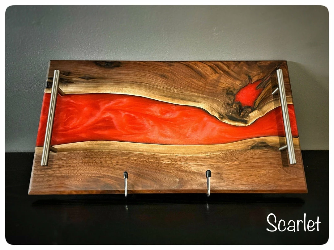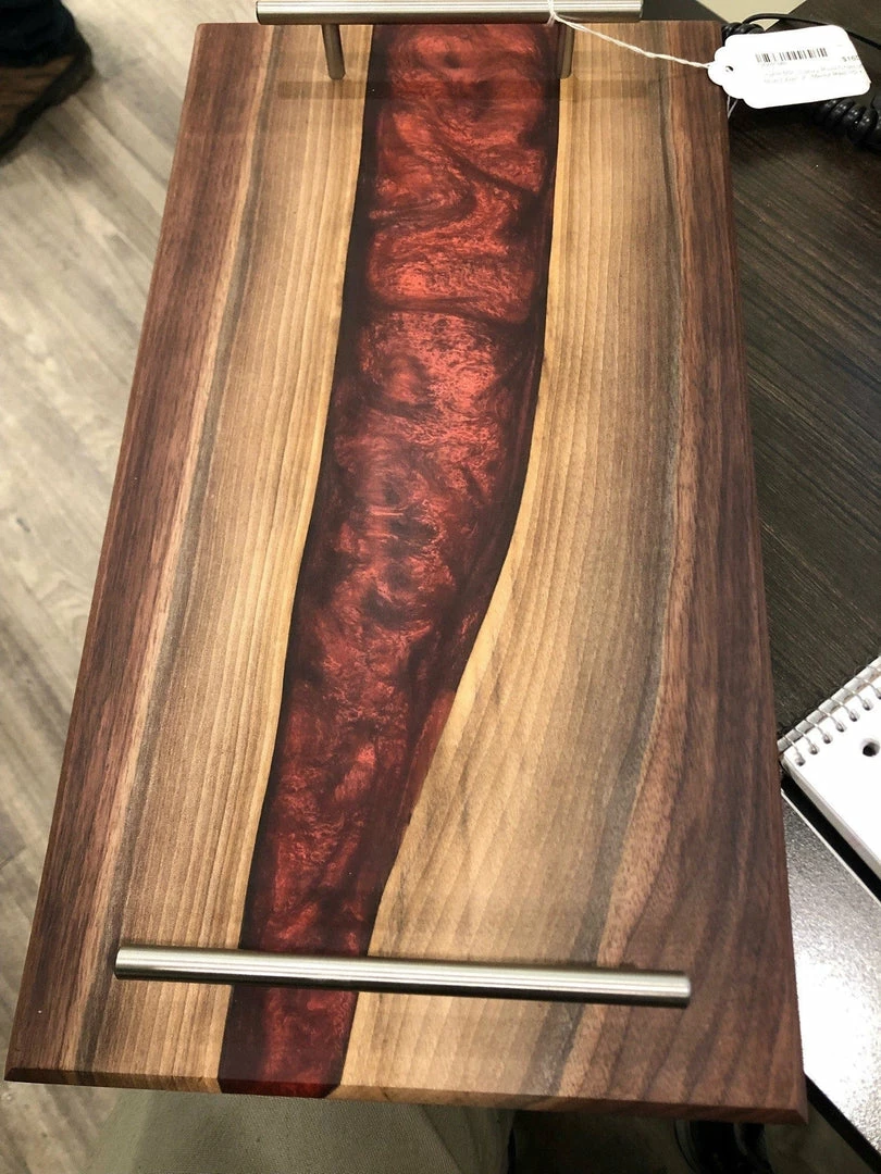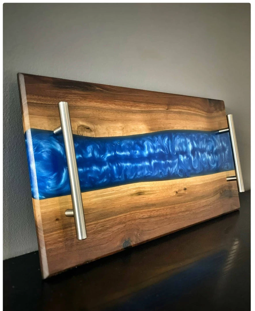 Handmade charcuterie board crafted from Black Walnut with your choice of a blue or black resin river. Handmade to order with passion and attention to detail. This serving platter is completely food safe and easy to care for. This piece is ready for years of enjoyment in your home and will be a great conversation piece when entertaining guests.
