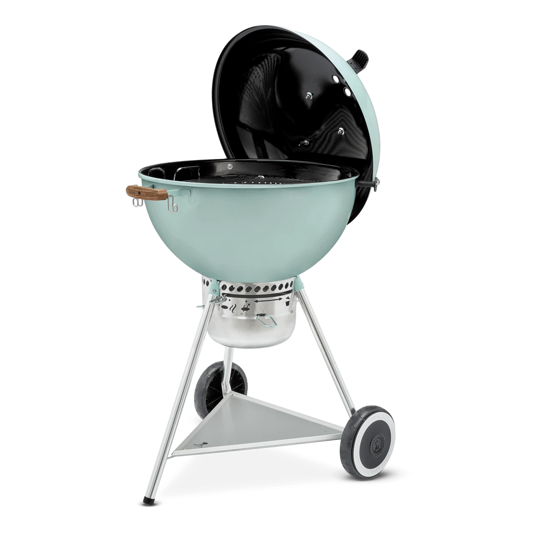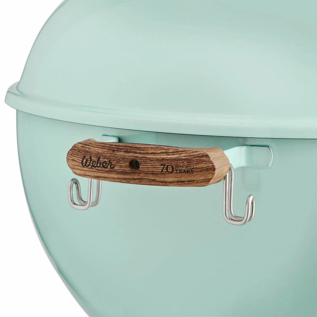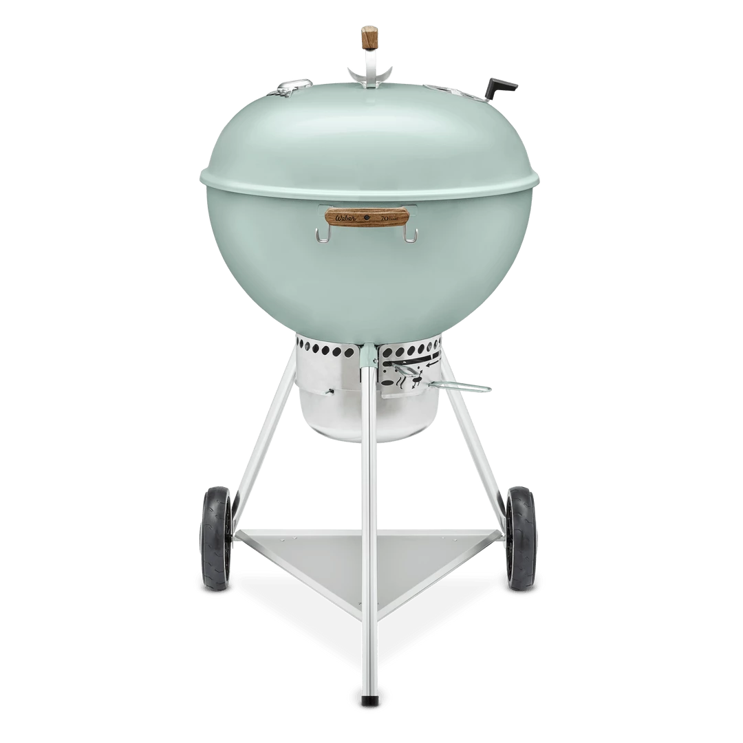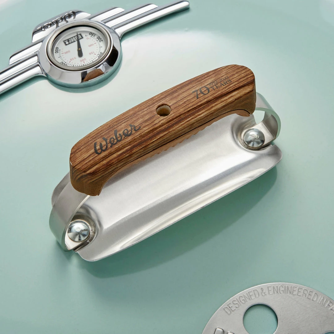 The limited-edition 70th Anniversary Kettle is a high-quality Weber kettle you’ve come to expect combined with nostalgic and modern features. Nods to different eras of Weber’s history can be found throughout its thoughtfully detailed exterior. Hand-enameled Hollywood Gray, is reminiscent of classic films from the 1950s era when the kettle originated. Other retro features include a solid bottom utility tray for storage, a ‘50s hood-ornament themed lid thermometer, white-walled wheels, and wood-like nylon handles. All of it comes together to create a grilling experience worthy of celebration.