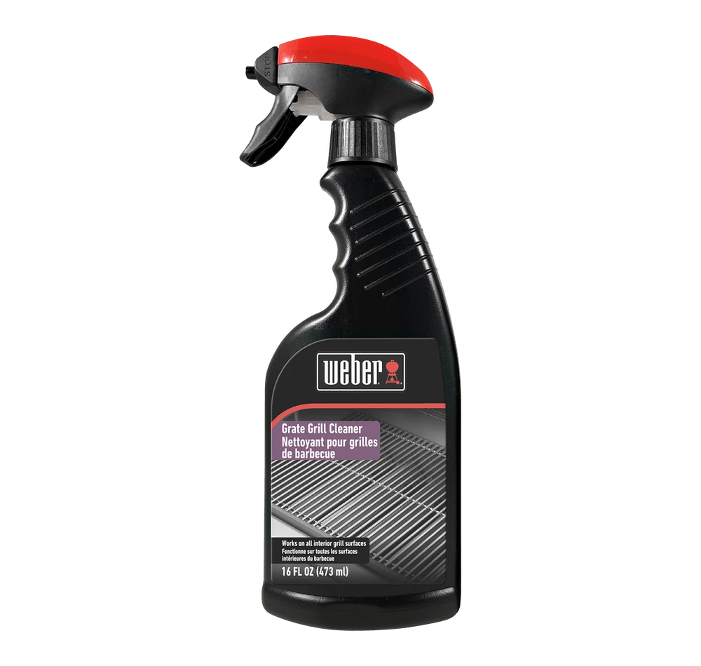 Weber’s Grate Grill Cleaner has been designed to allow you to quickly, safely, and effectively clean your cooking grates. Liberally apply to your grill’s cool exterior surface. Remove with sponge, towel or high-quality paper towel. Repeat as necessary. If stain persists, use Weber Stubborn Stain Remover. Always turn nozzle to “OFF” position before storing. Warning: Clean an inconspicuous area first to avoid possible print damage to your grill. Some inks or decals printed on knobs, control panels and other surfaces may be affected.