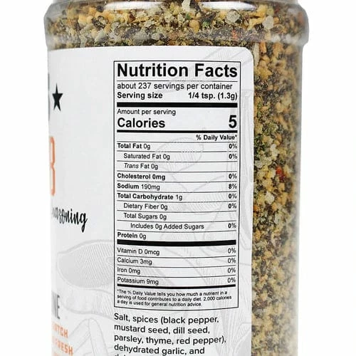 A fresh, course-ground all-purpose seasoning with salt, onion, garlic, parsley, and thyme — heightened with cracked black pepper, red pepper, mustard seed, and dill. A lively spin on the traditional all-purpose seasoning, it will easily become the go-to for daily cooking. Perfect on burgers, steak, chicken, turkey and takes things to a new level on potato chips and fries. All this handcrafted right here in the U.S.A.Â